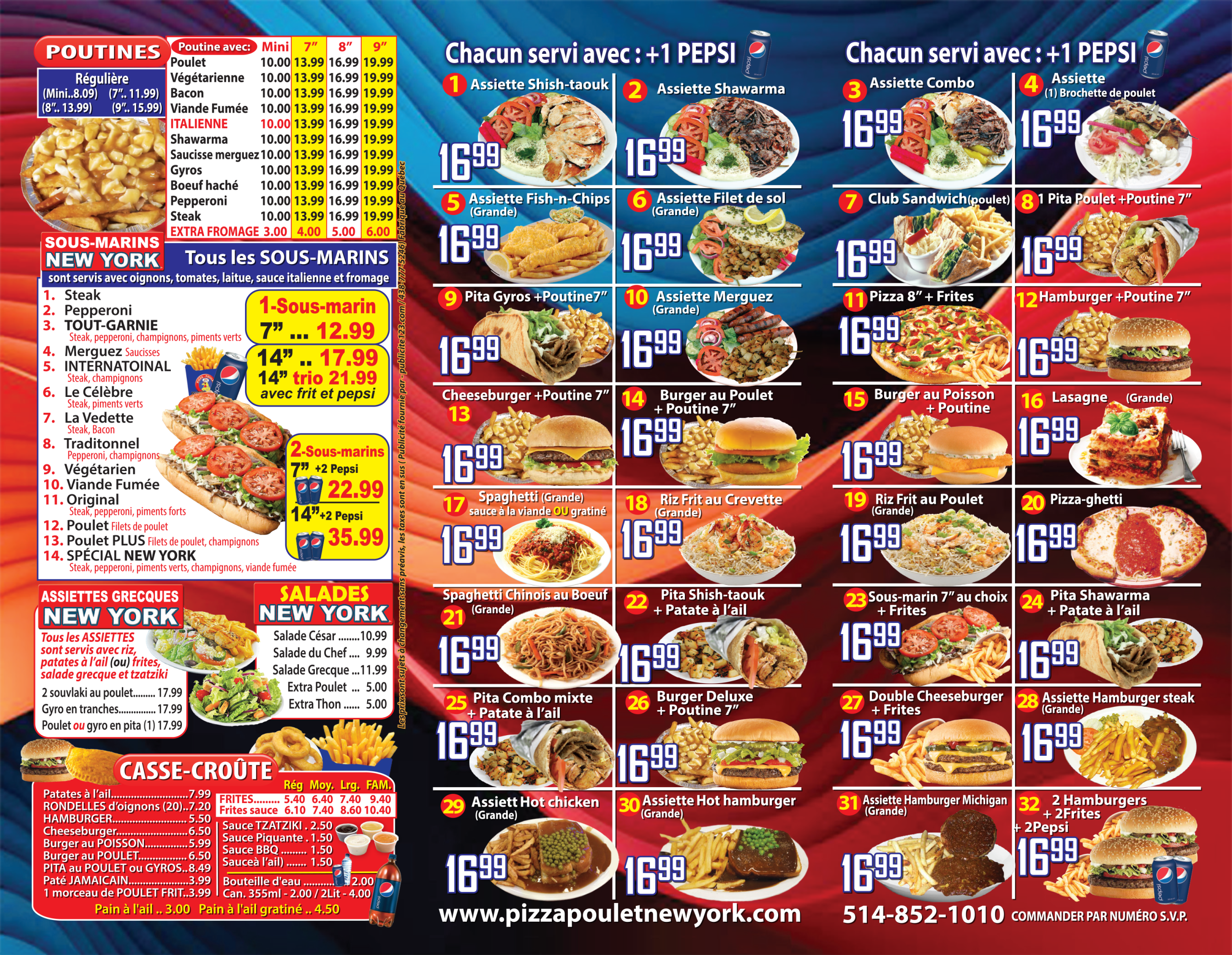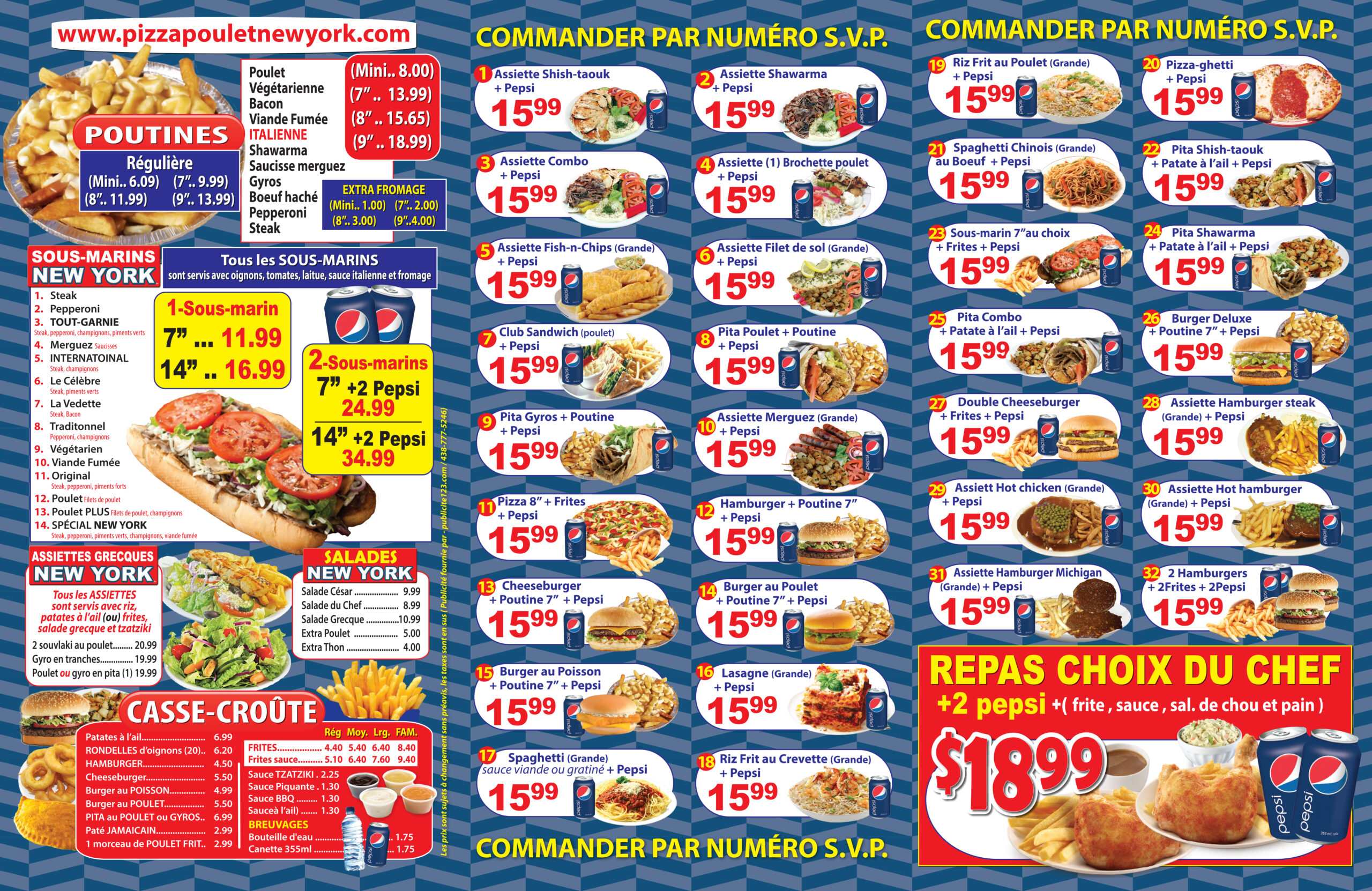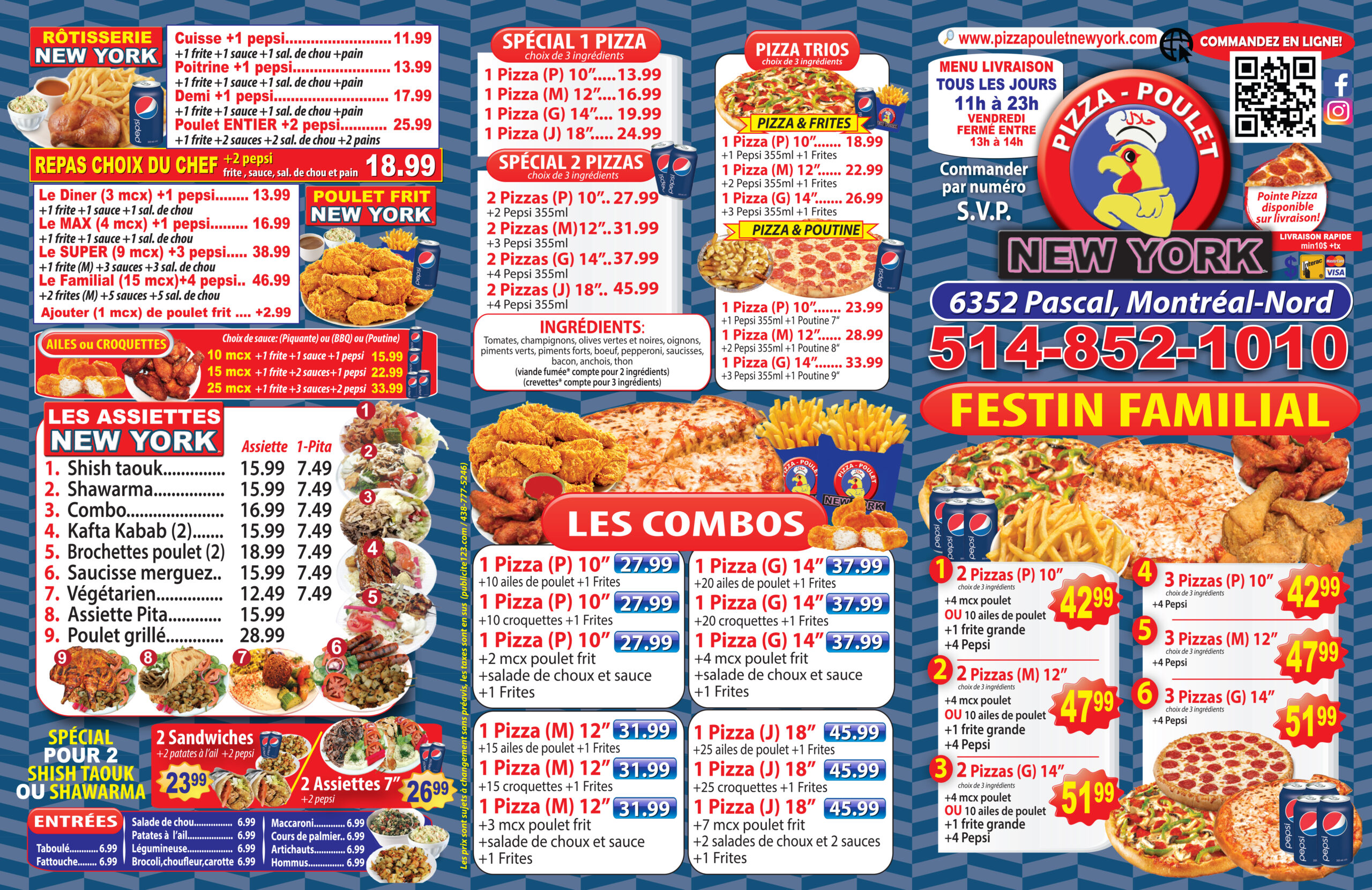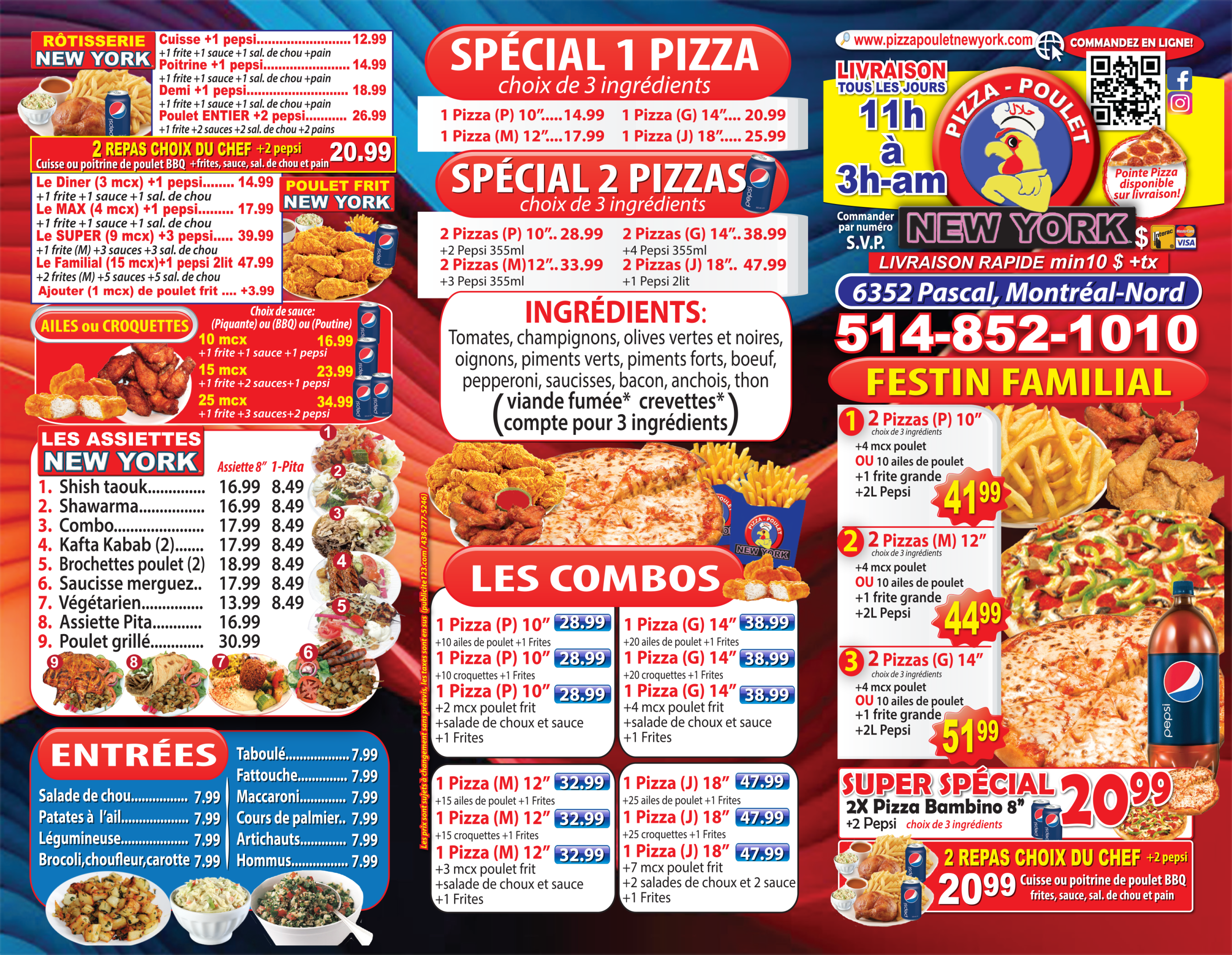 VOIR Menu et COMMANDEZ Bienvenue chezPizza Poulet New York 514-852-1010 6352 Rue PascalMontréal-NordQC H1G 1T5